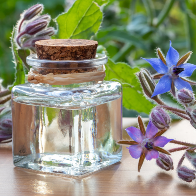 Borákový olej – bohatý na omega-6 a gama-linolénovú kyselinu, podporuje imunitu pokožky, regeneráciu a má protizápalové účinky.